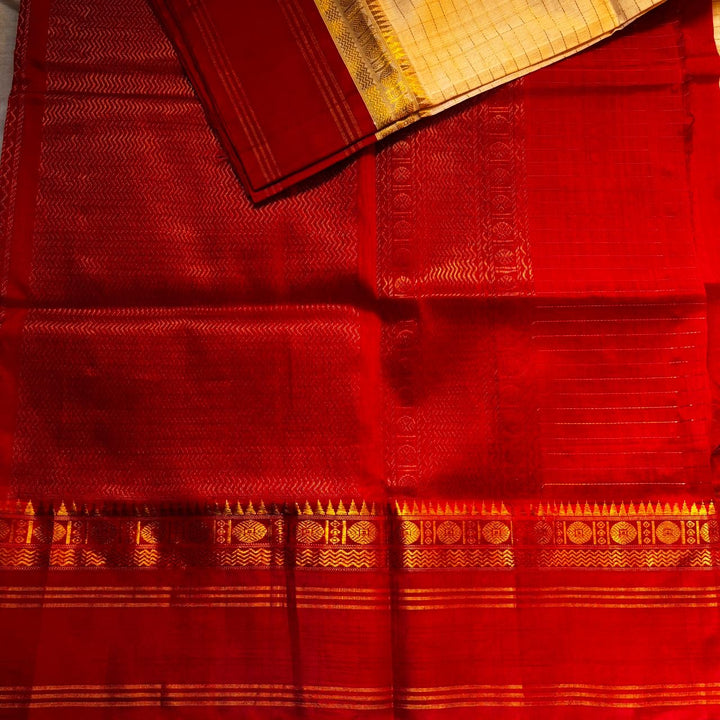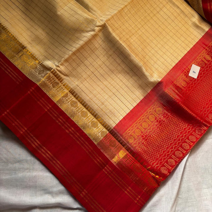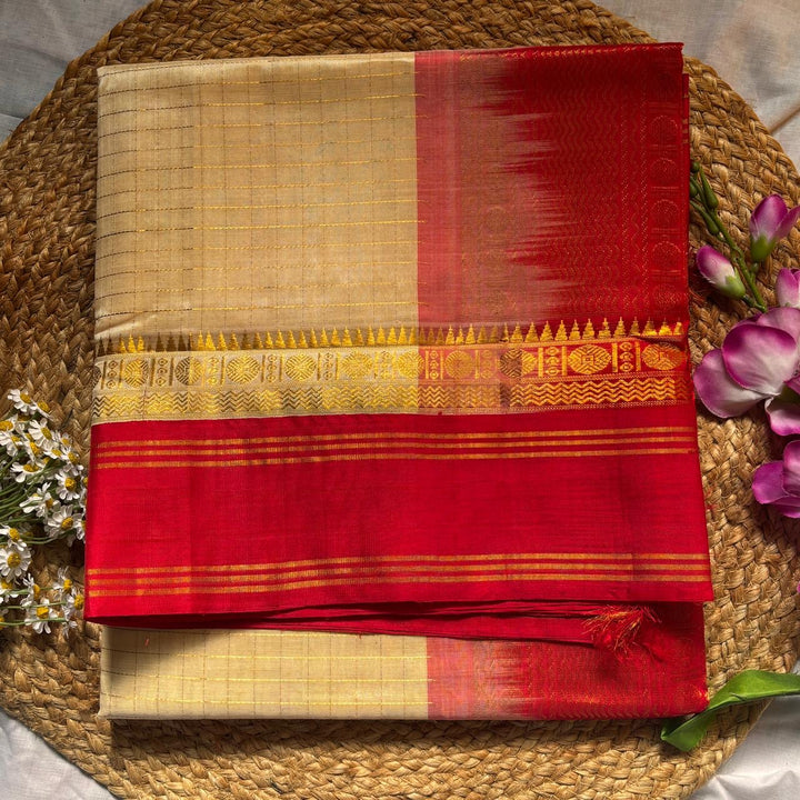 Handwoven Kanchi Silkcotton in Beige Shade comes with a Red blouse and Pallu.