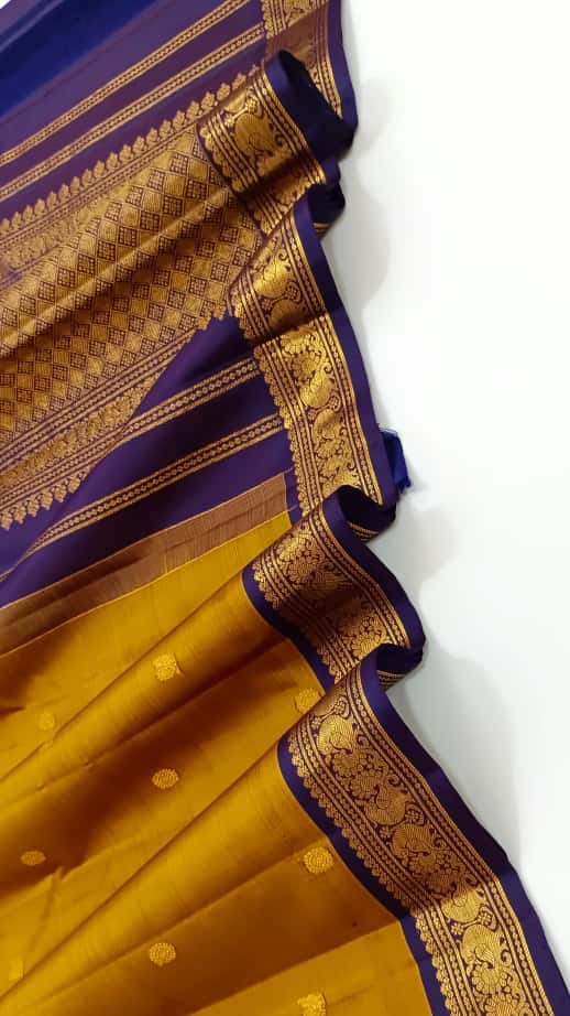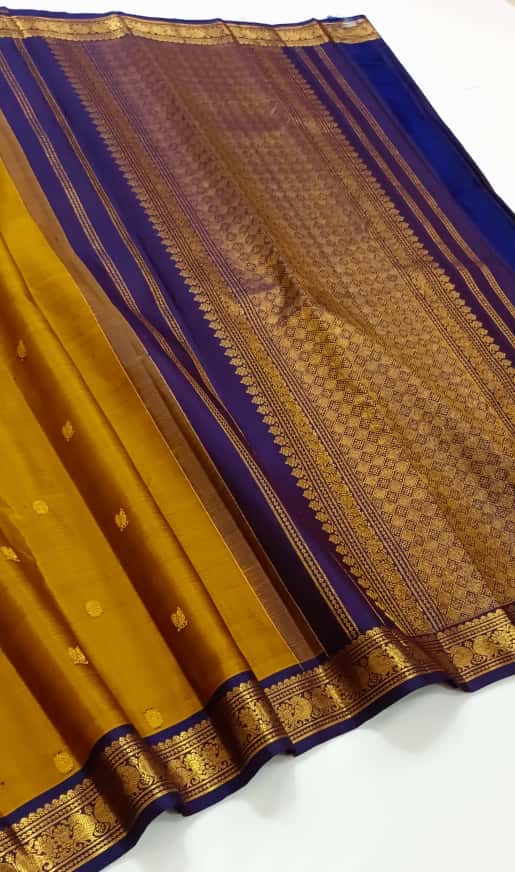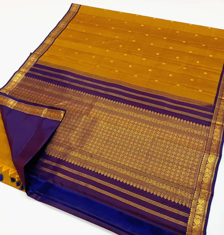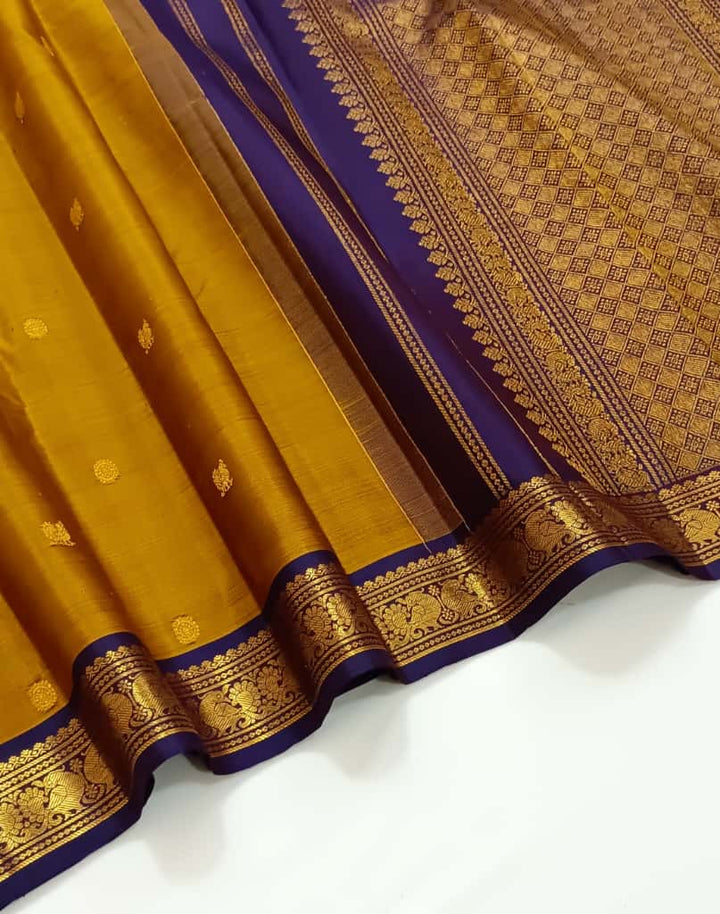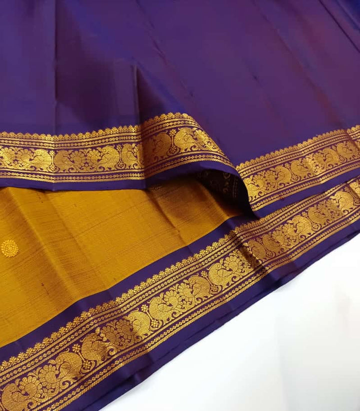 Exquisite Handwoven kancheevaram Silk in Biscuit Brown shade with a beautiful Contrast Electric Purple pallu and blouse.