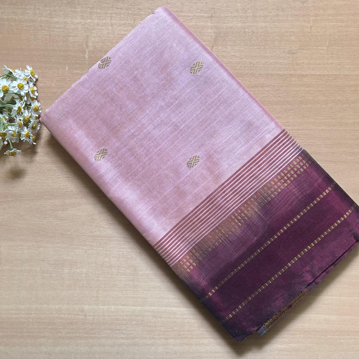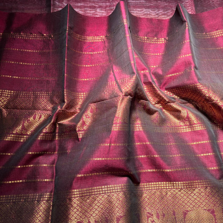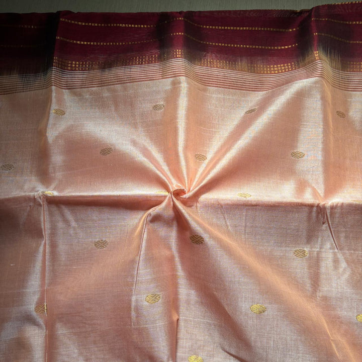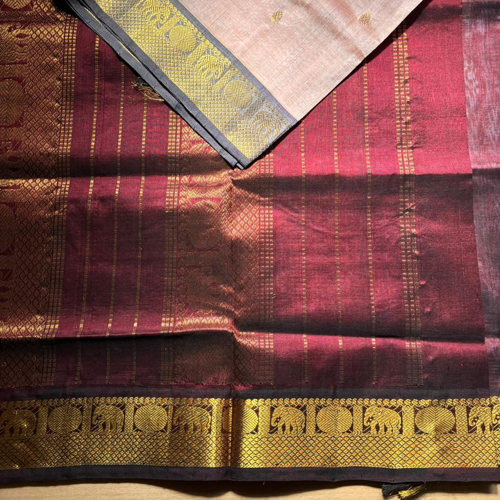 Handwoven Kanchi Silkcotton in Peach Shade comes with a Coffee Brown blouse and Pallu.