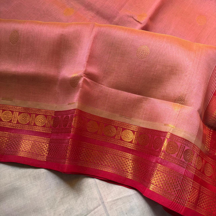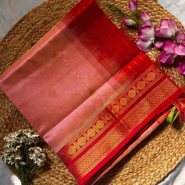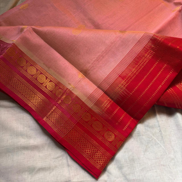 Handwoven Kanchi Vairoosjib Silkcotton in Pastel Pink Shade comes with a Red blouse and Pallu.