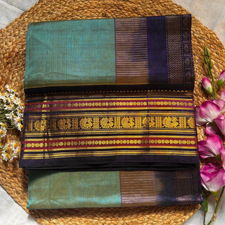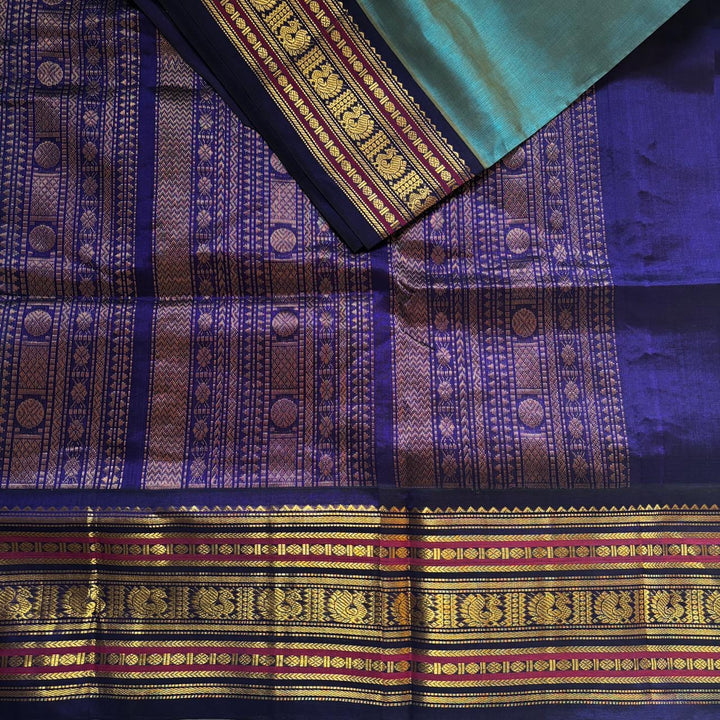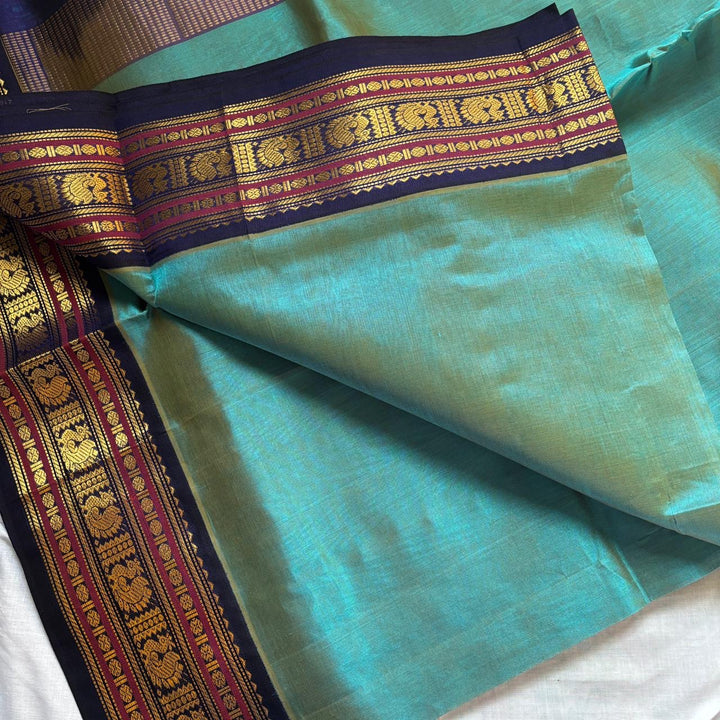 Handwoven Kanchi korvai Silkcotton in Turquoise Shade comes with a Electric Blue blouse and Pallu.