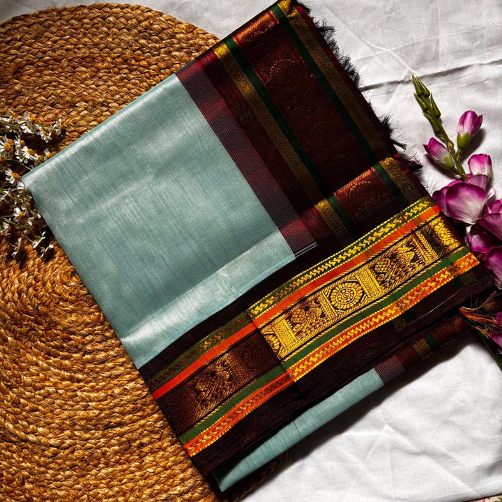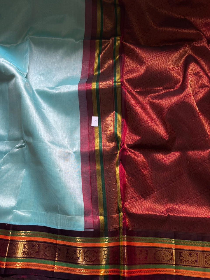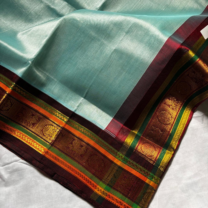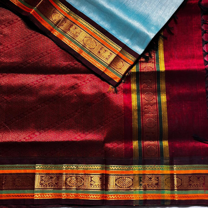 Handwoven Kanchi korvai Silkcotton in Sky Blue Shade comes with a coffee brown blouse and Pallu.