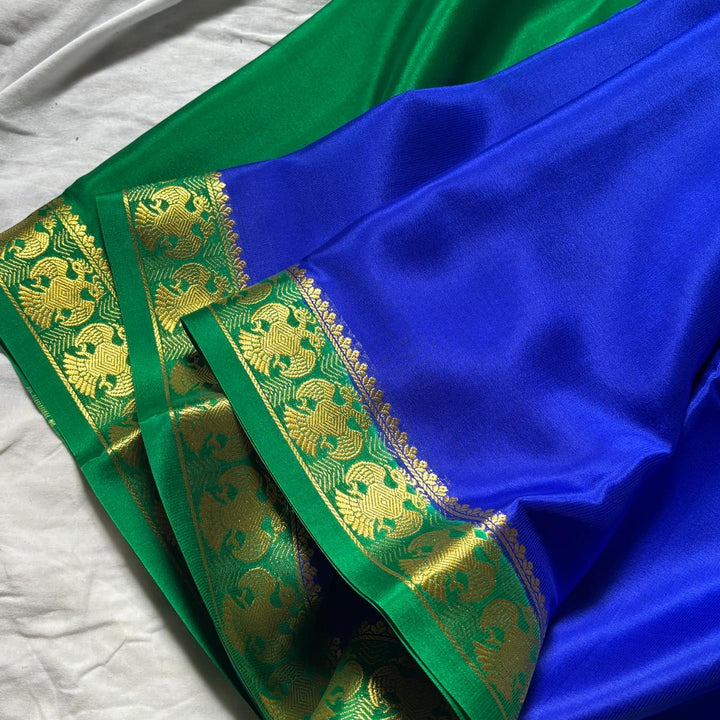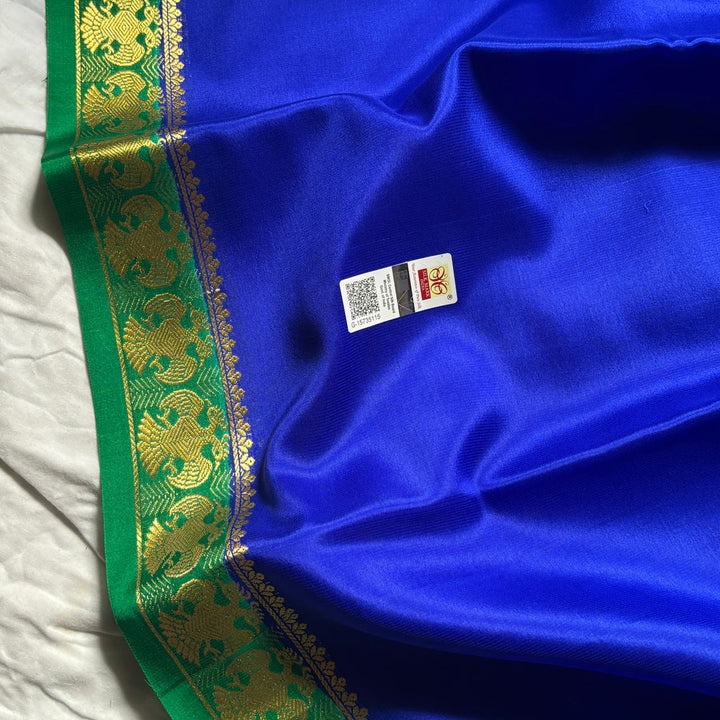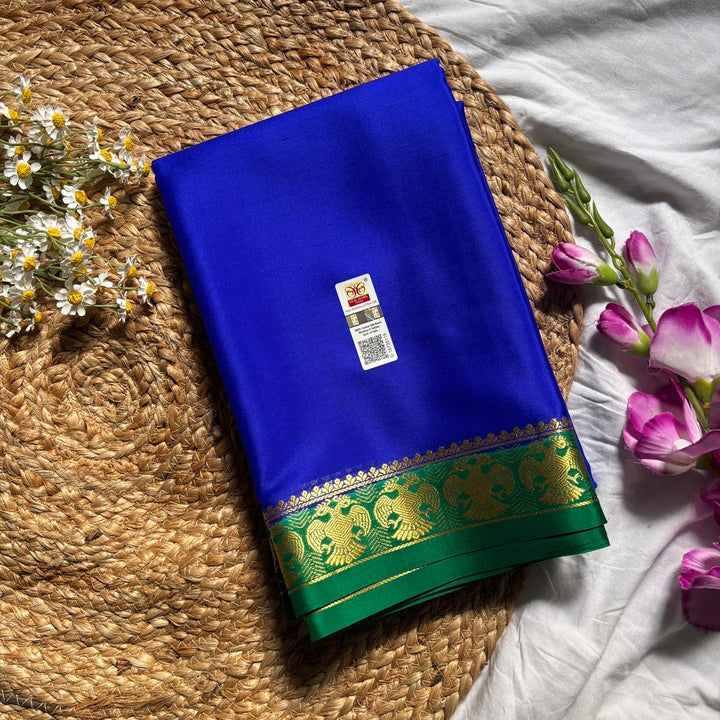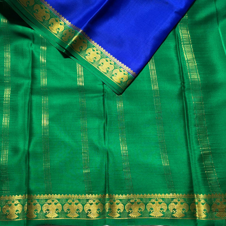 Exquisite Pure Mysore Silk in Blue shade comes with a beautiful Contrast Green pallu and blouse.
