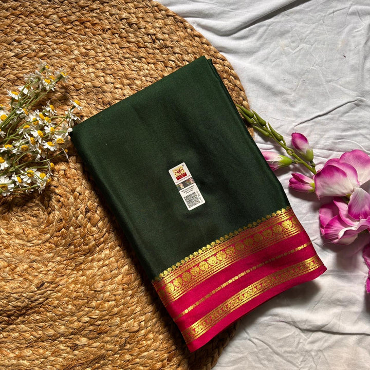 Exquisite Pure Mysore Silk in Bottle Green shade comes with a beautiful Contrast Mittai Pink pallu and blouse. This is a 65gsm pure mulberry silk saree...