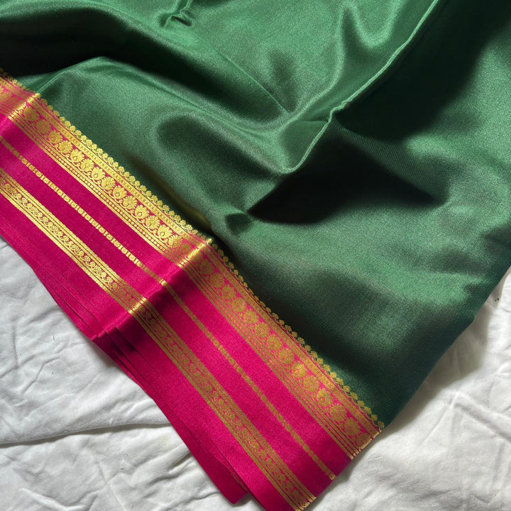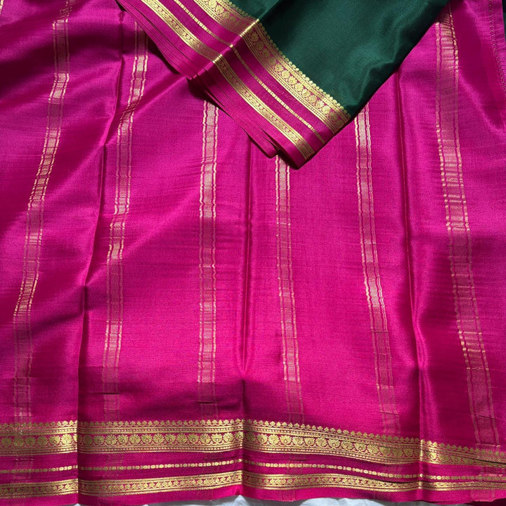 Exquisite Pure Mysore Silk in Bottle Green shade comes with a beautiful Contrast Mittai Pink pallu and blouse.