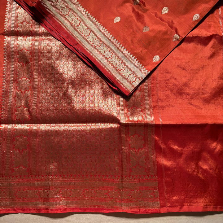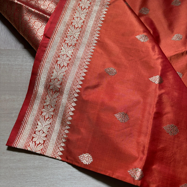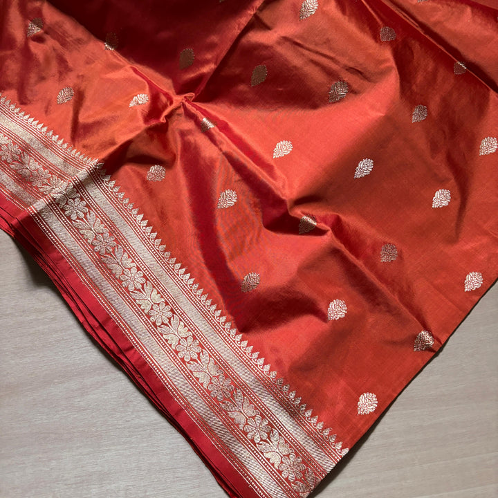Handwoven Banarasi Katan Silk Saree in Prettiest Burnt Orange Shade , comes with an running blouse.