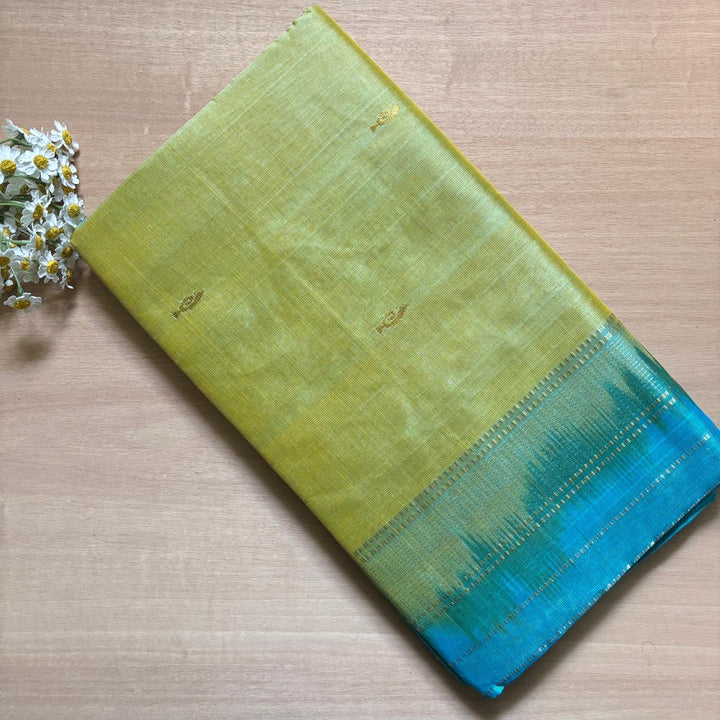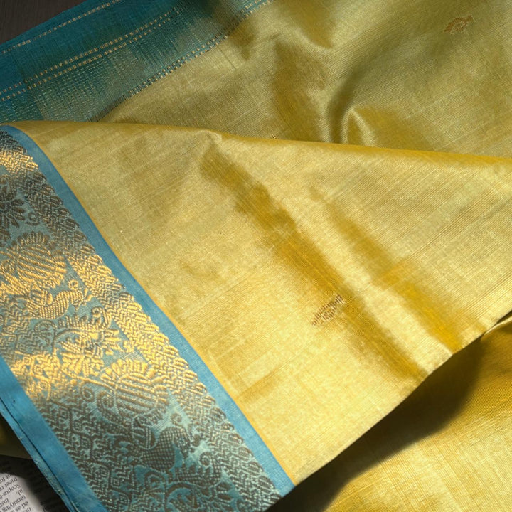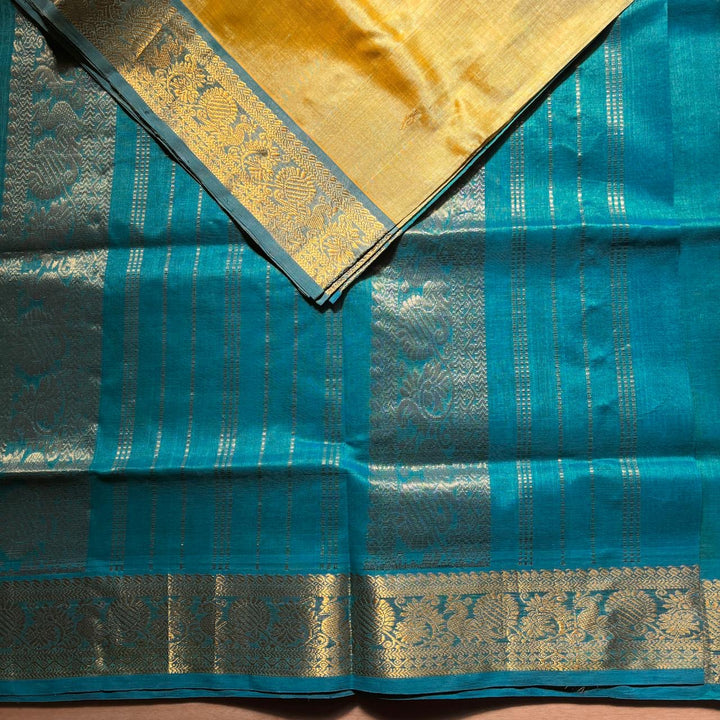 Handwoven Kanchi Silkcotton in Dual Shade Butter Shade comes with a Sky Blue blouse and Pallu.