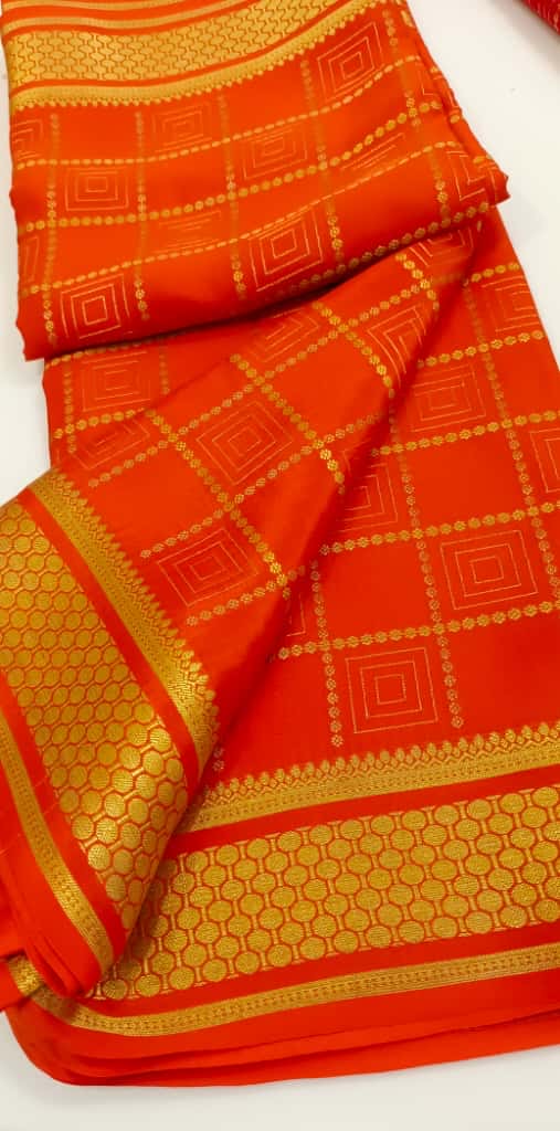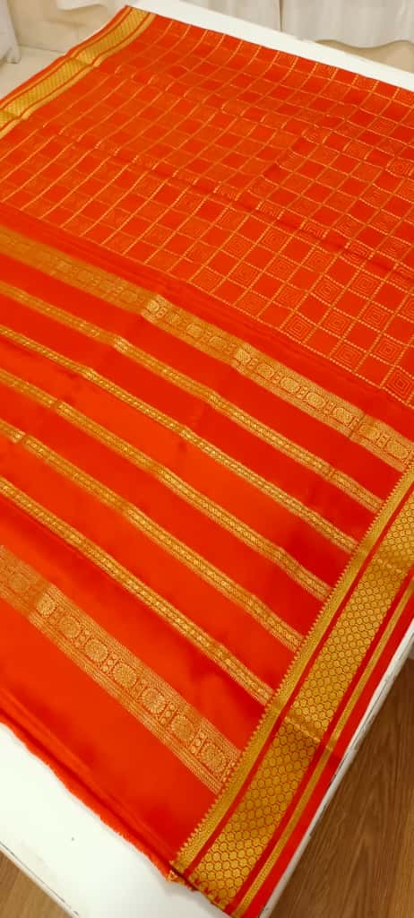 Exquisite Pure Mysore Silk in Checks Fanta Orange shade comes with a beautiful Self pallu and blouse.