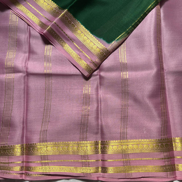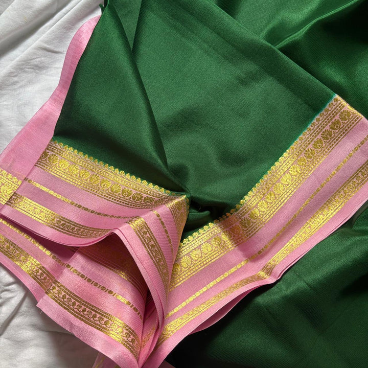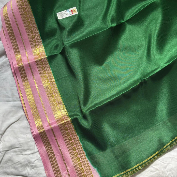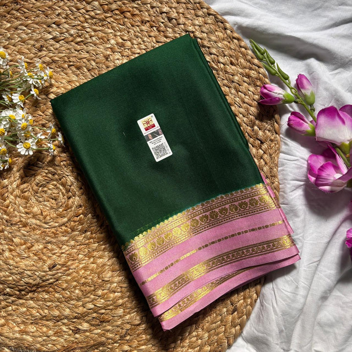 Exquisite Pure Mysore Silk in Bottle Green shade comes with a beautiful Contrast Pink pallu and blouse.