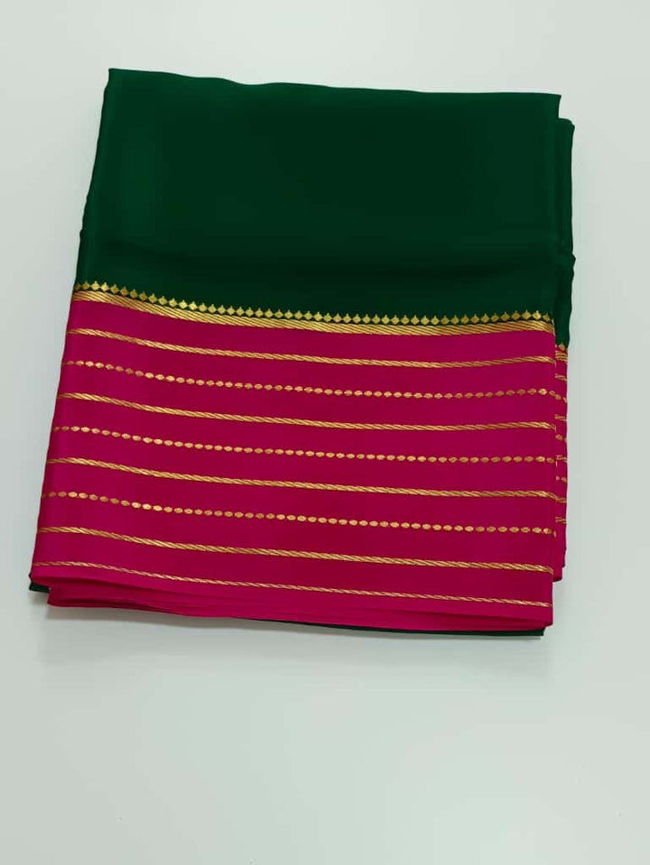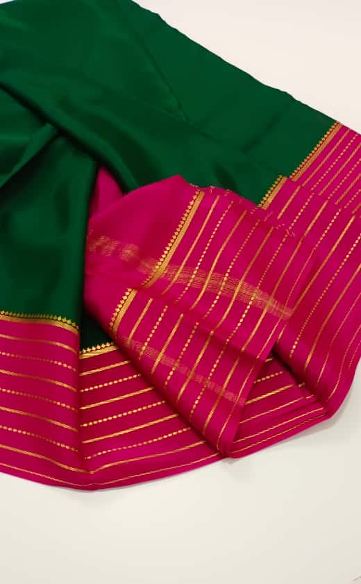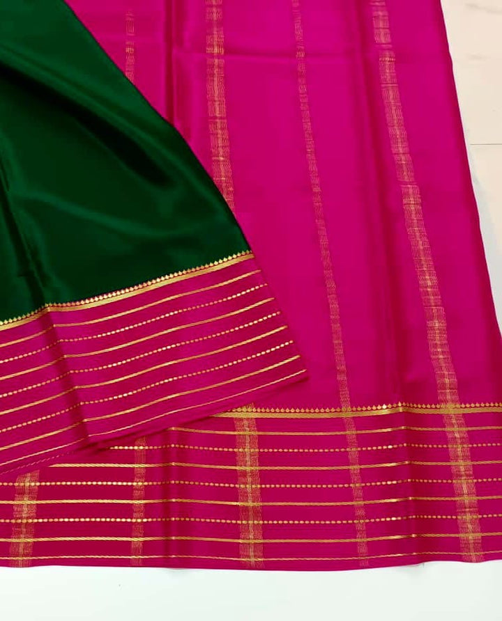 Exquisite Pure Mysore Silk in Bottle Green shade comes with a beautiful Self Pink pallu and blouse. This is a 85gsm pure mulberry silk saree with silk fast...