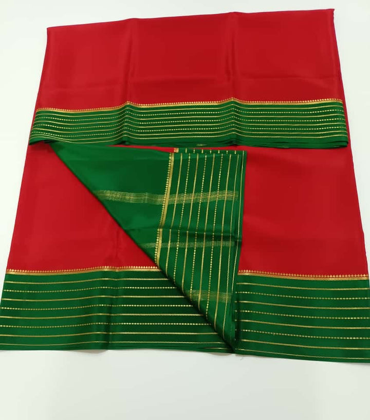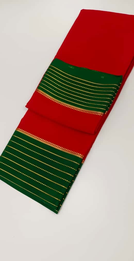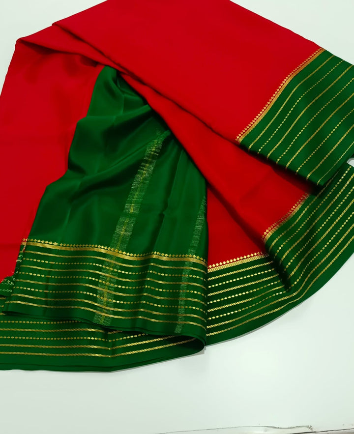 Exquisite Pure Mysore Silk in Red Green shade comes with a beautiful green pallu and blouse.