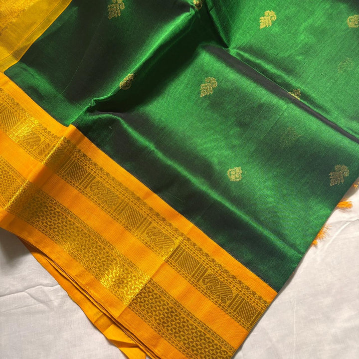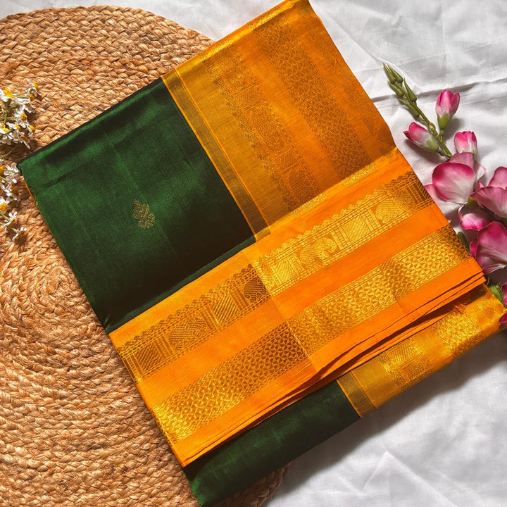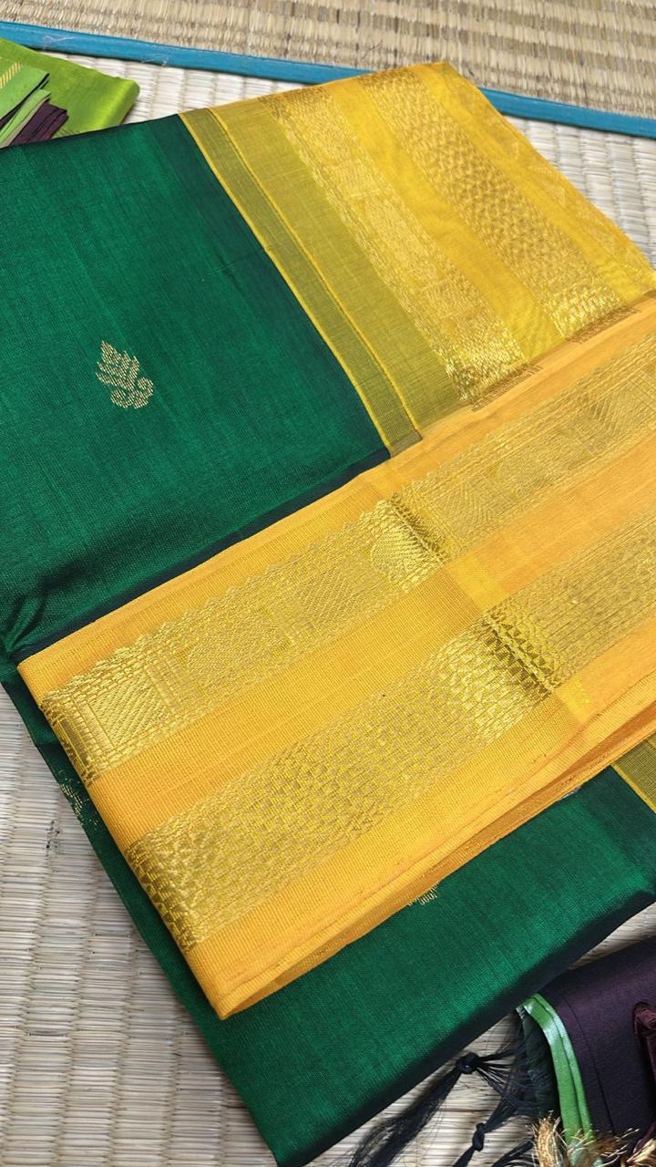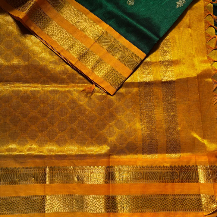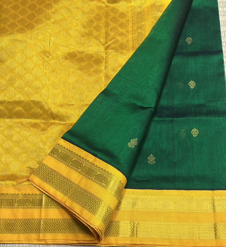 Handwoven Kanchi korvai Silkcotton in Bottle green Shade comes with a Mango blouse and Pallu.