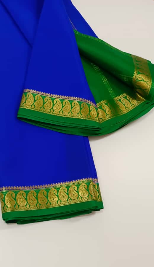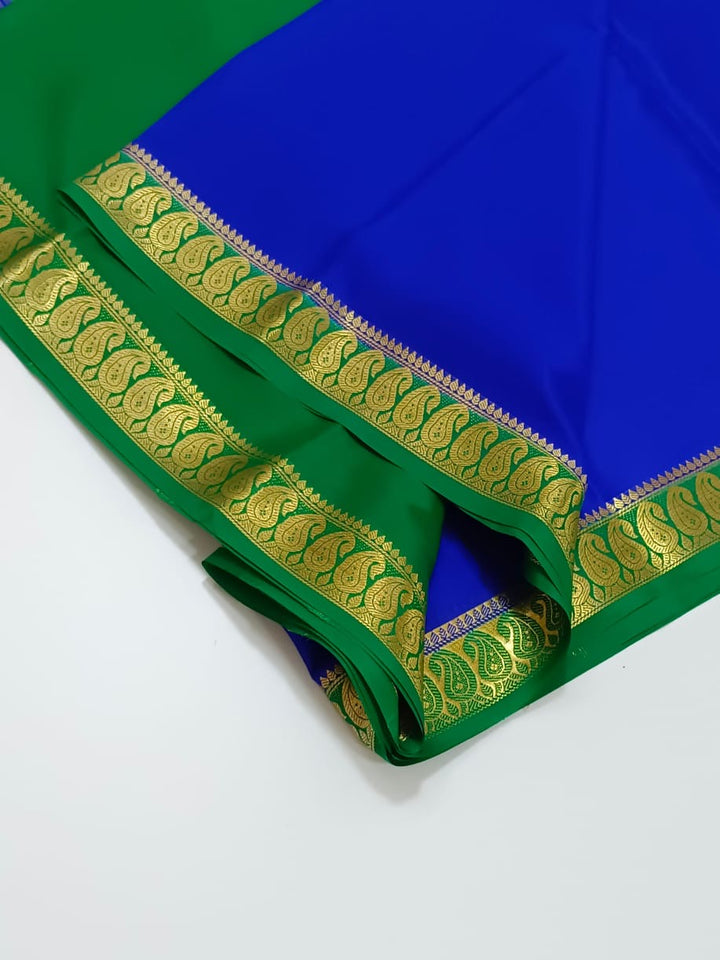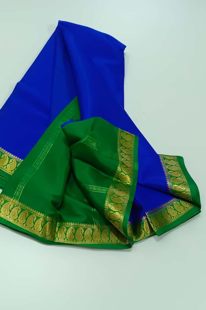Exquisite Pure Mysore Silk in Blue shade comes with a beautiful Contrast Green pallu and blouse.