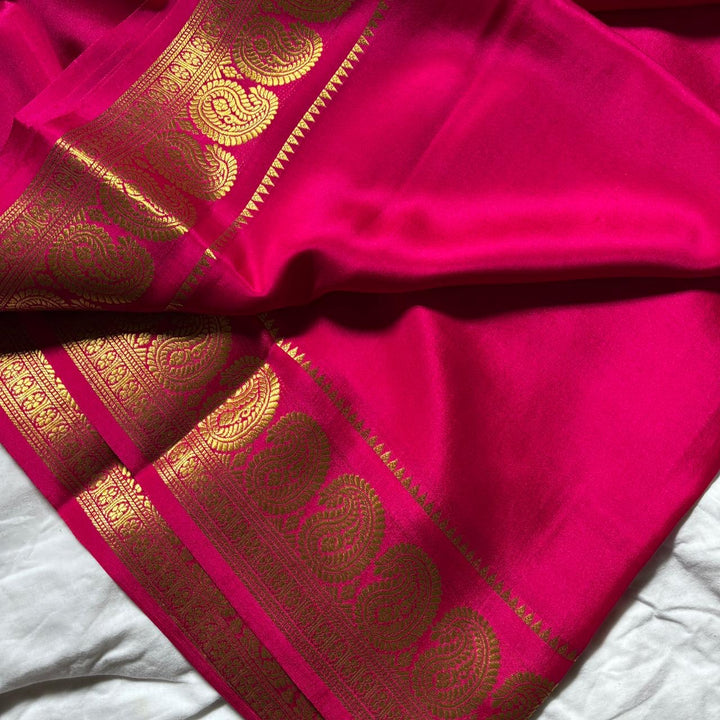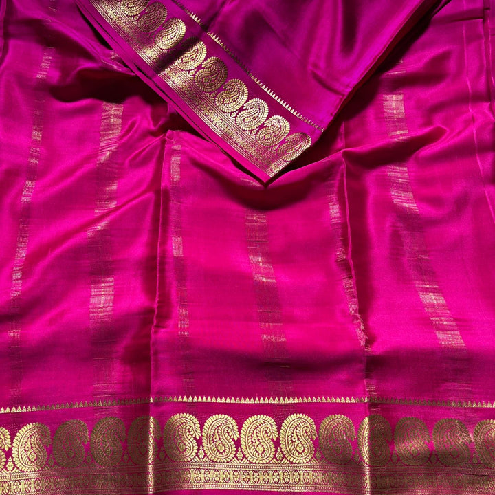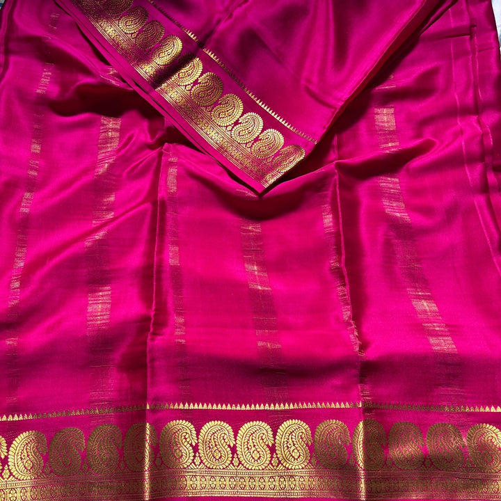 Exquisite Pure Mysore Silk in Mittai Pink shade comes with a beautiful Self Pink pallu and blouse. This is a 120gsm pure mulberry silk saree with silk...