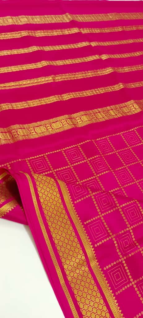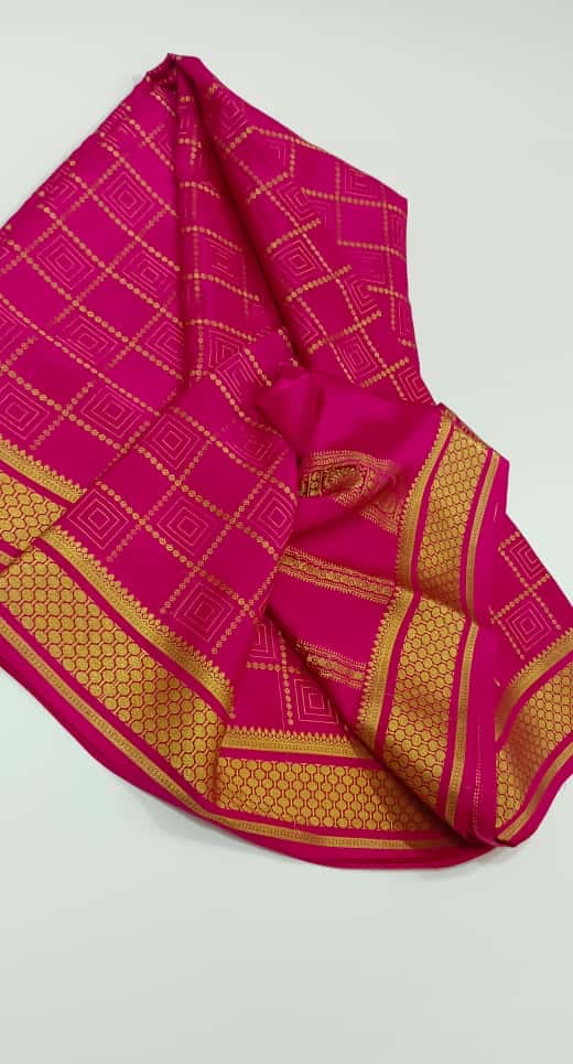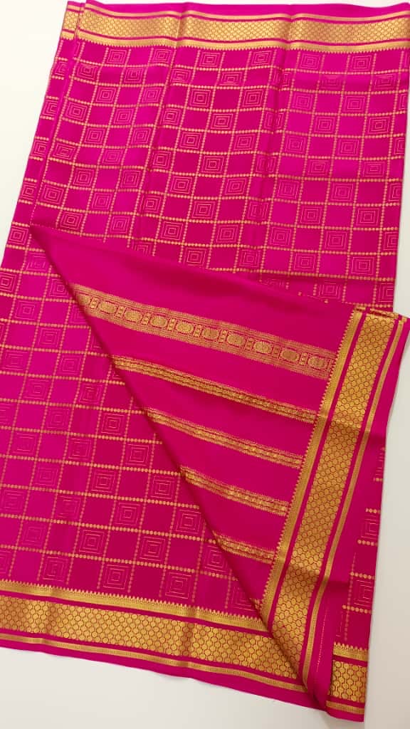 Exquisite Pure Mysore Silk in Checks Mittai Pink shade comes with a beautiful Self pallu and blouse. This is a 120gsm pure mulberry silk saree with silk...