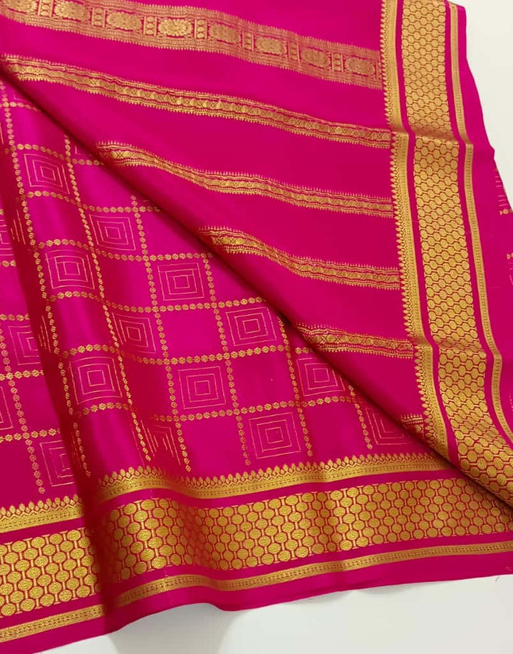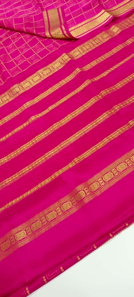 Exquisite Pure Mysore Silk in Checks Mittai Pink shade comes with a beautiful Self pallu and blouse.