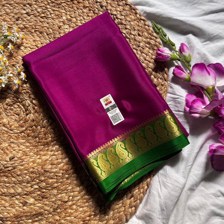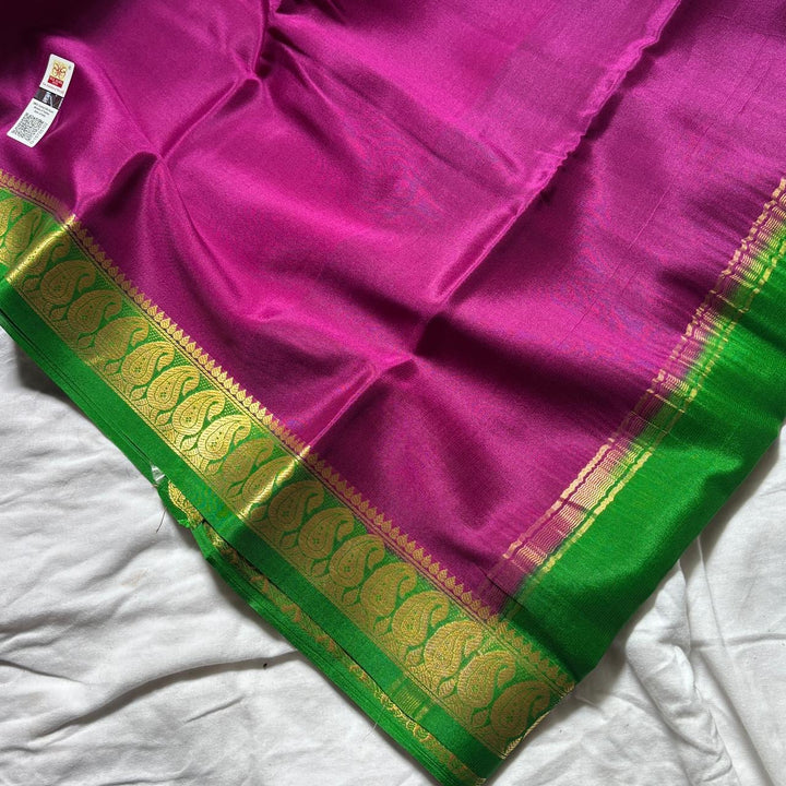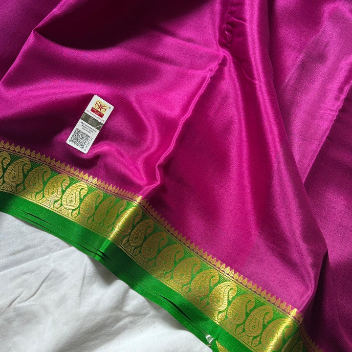 Exquisite Pure Mysore Silk in Mittai Pink shade comes with a beautiful Contrast Green pallu and blouse. This is a 65gsm pure mulberry silk saree with...