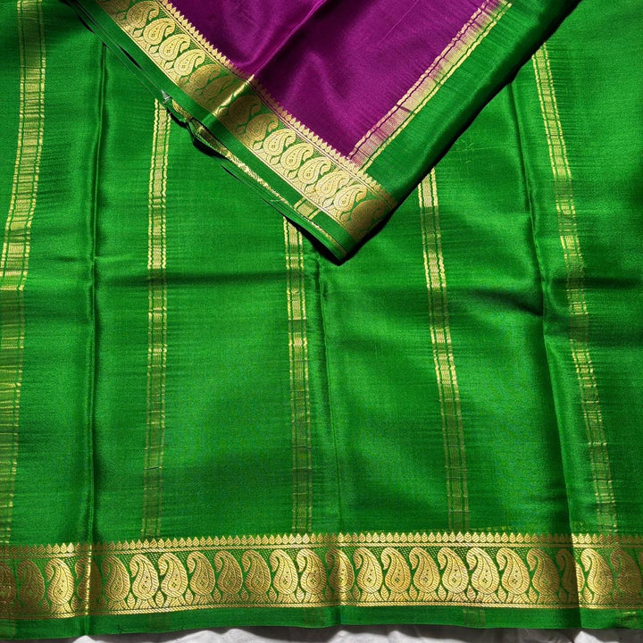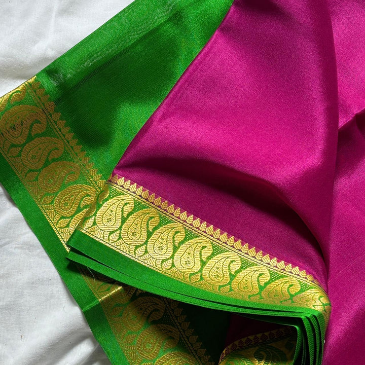 Exquisite Pure Mysore Silk in Mittai Pink shade comes with a beautiful Contrast Green pallu and blouse.