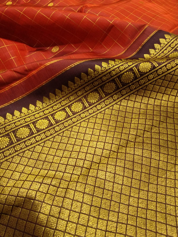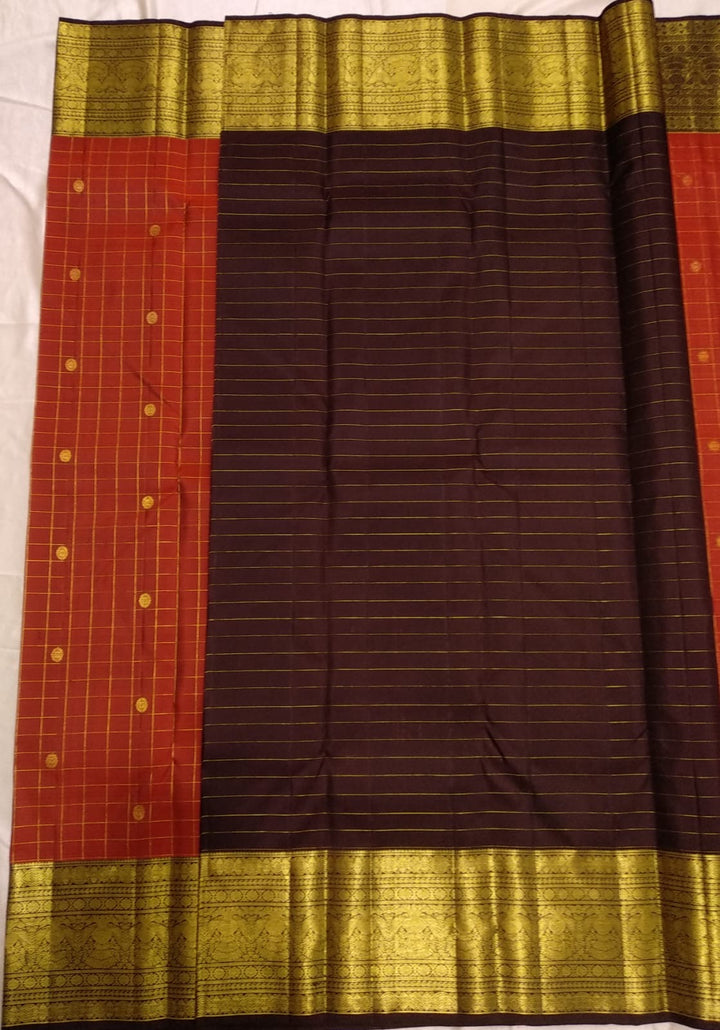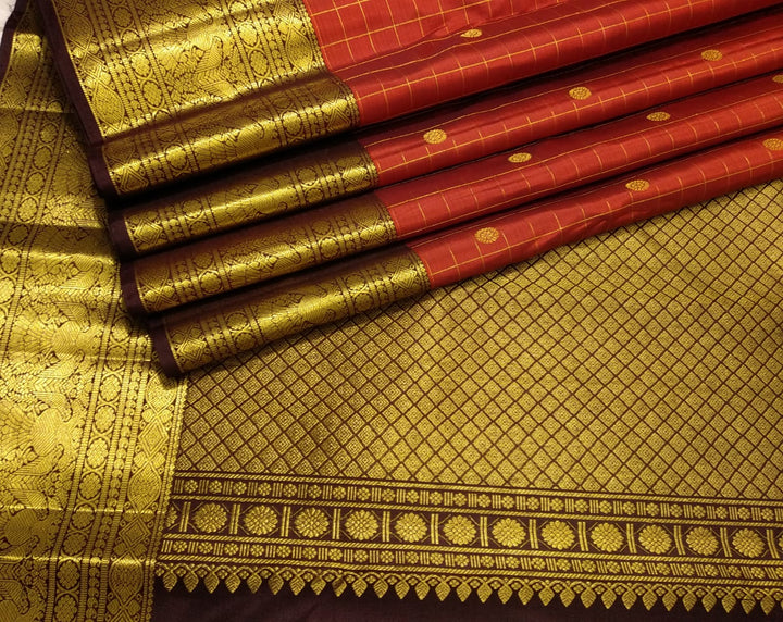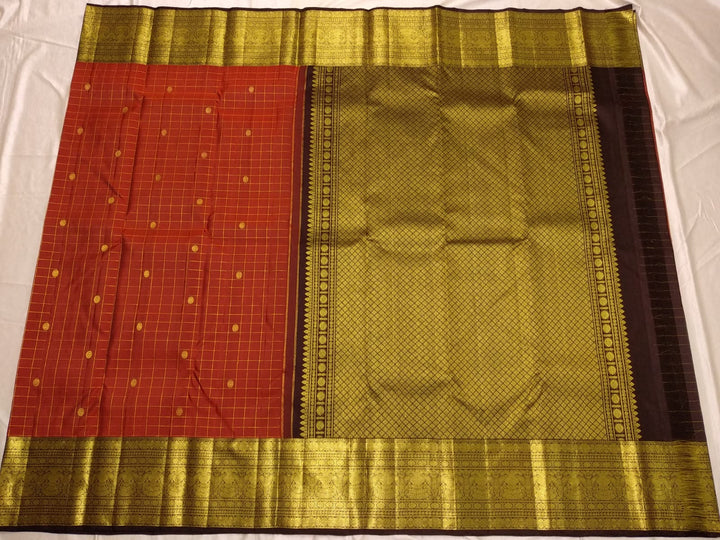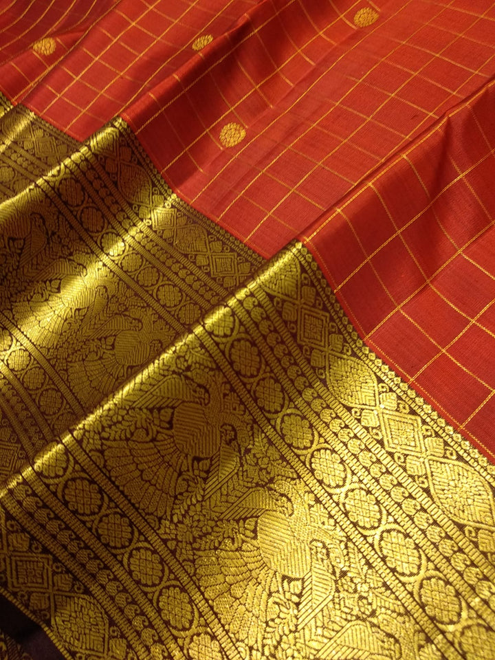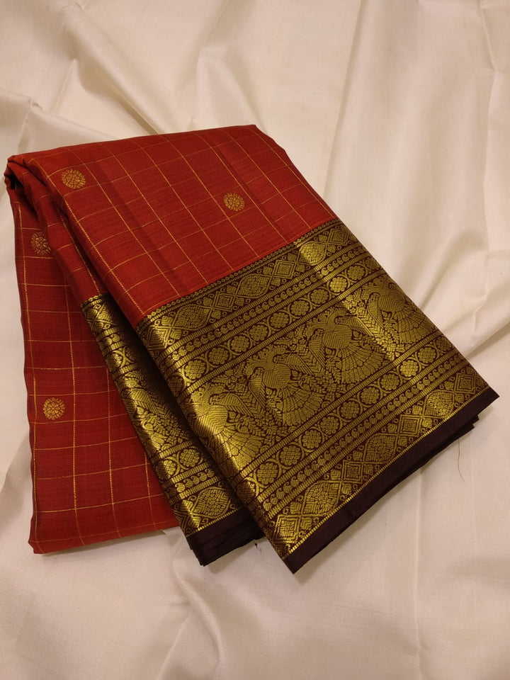 Exquisite Handwoven Kanchi Silk in Rust shade with a beautiful Contrast coffee brow pallu and blouse.