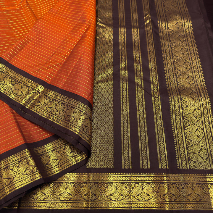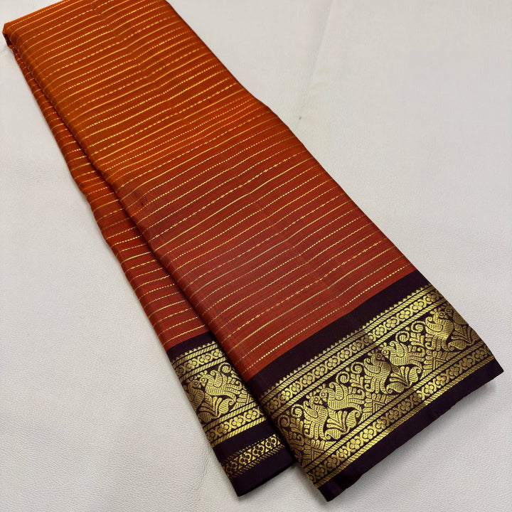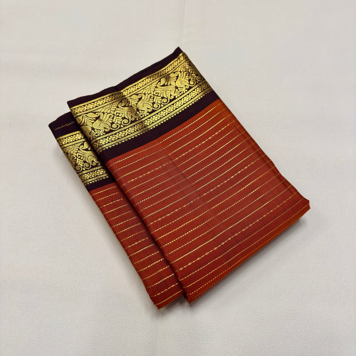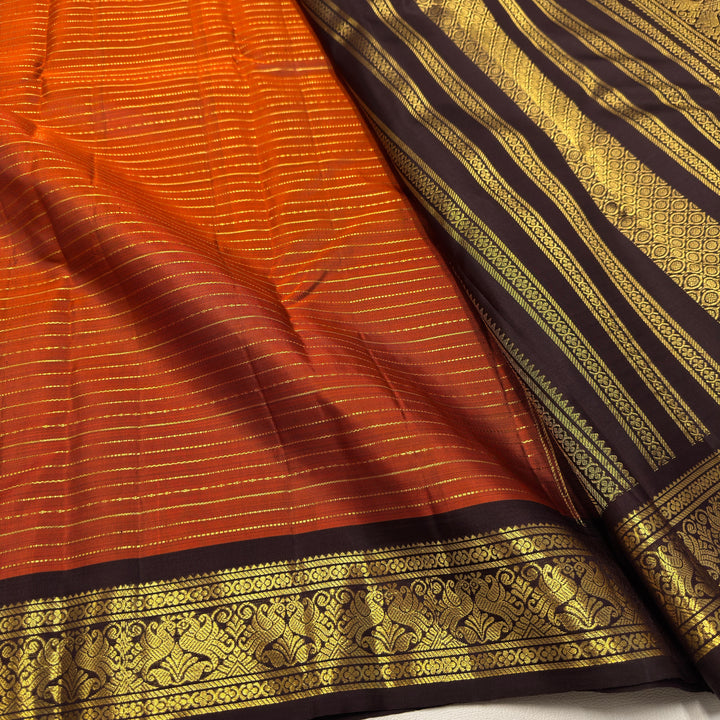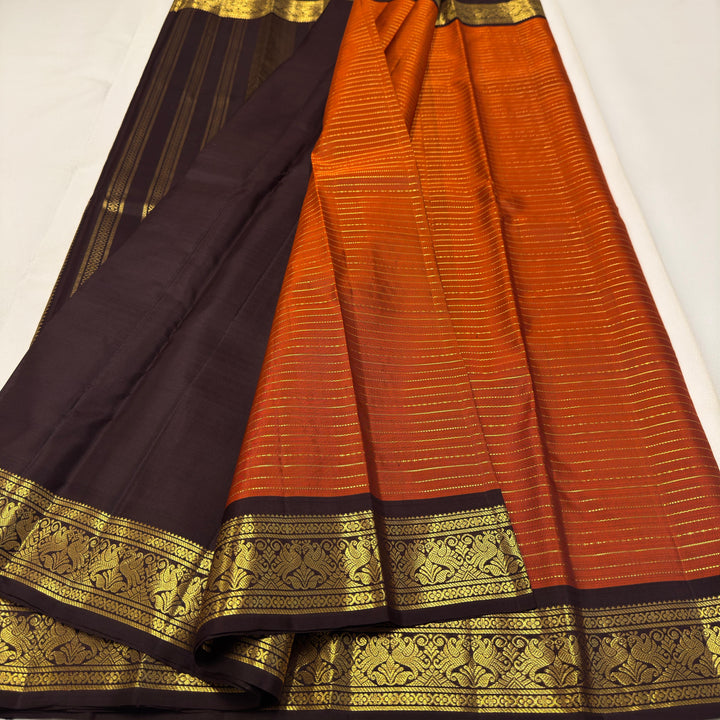 Exquisite Handwoven Kanchi Silk in Trending Rust shade with a beautiful Contrast Coffee Brown pallu and blouse.