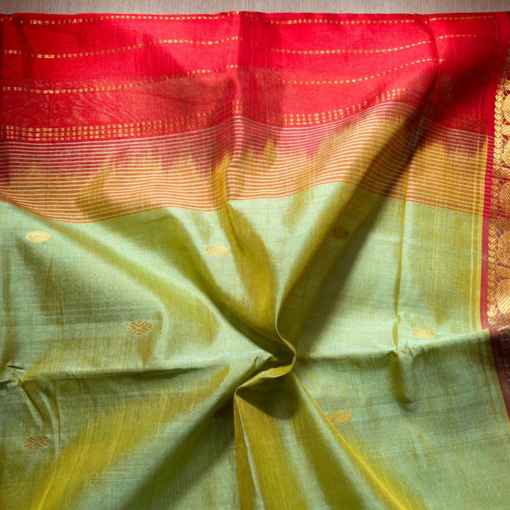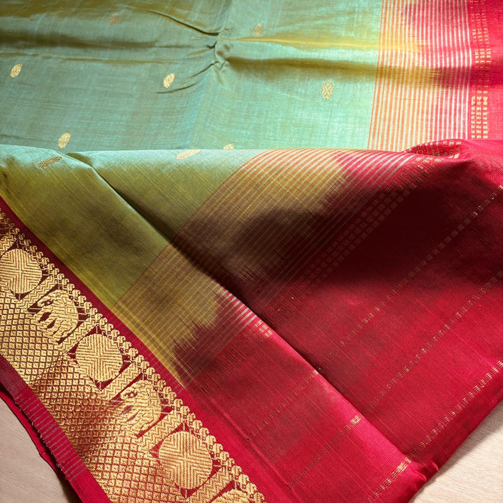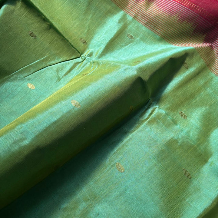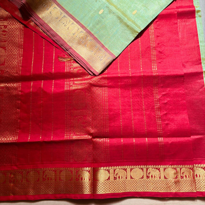 Handwoven Kanchi Silkcotton in Sage Green Shade comes with a Maroon Red blouse and Pallu.