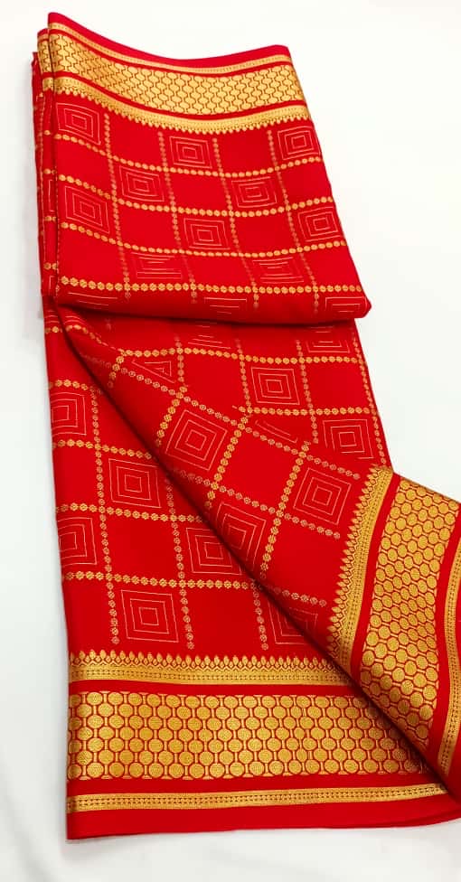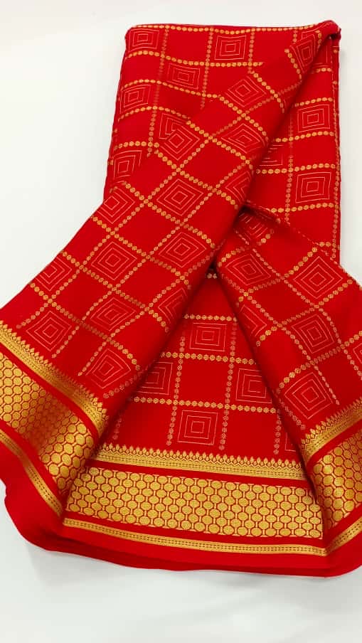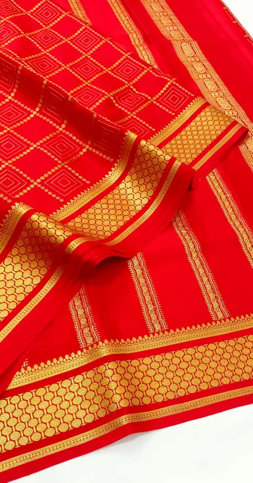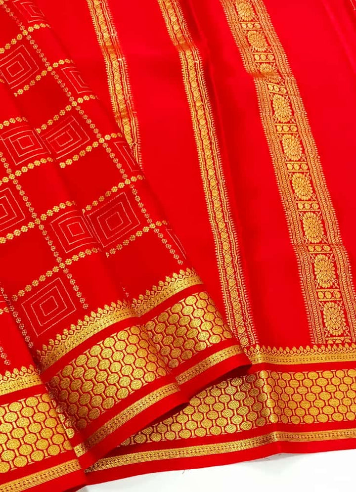 Exquisite Pure Mysore Silk in Checks Tomato Red shade comes with a beautiful Self pallu and blouse.