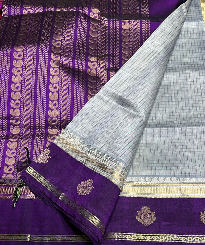 Handwoven Kanchi korvai Silkcotton in Pristine White Shade comes with a purple blouse and Pallu.